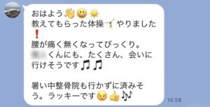 ただ結果的には呼吸エクササイズを2週間ほど実践してもらっただけで腰が痛くなくなったとメッセージをもらいました^^