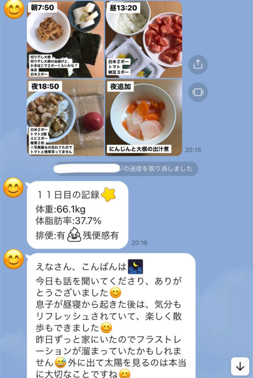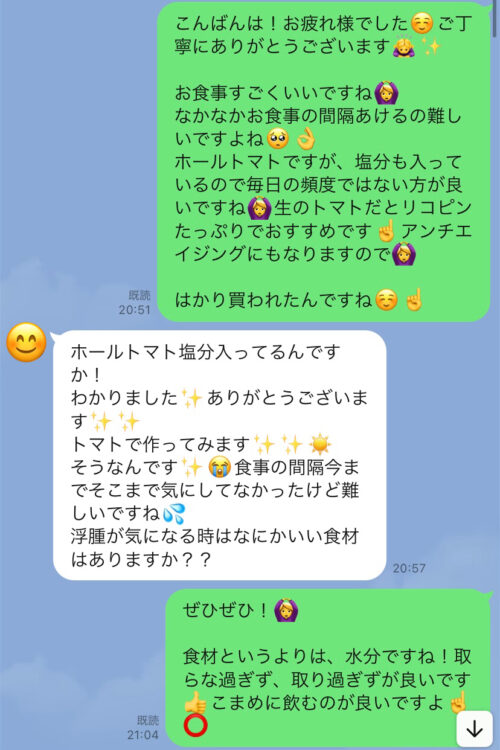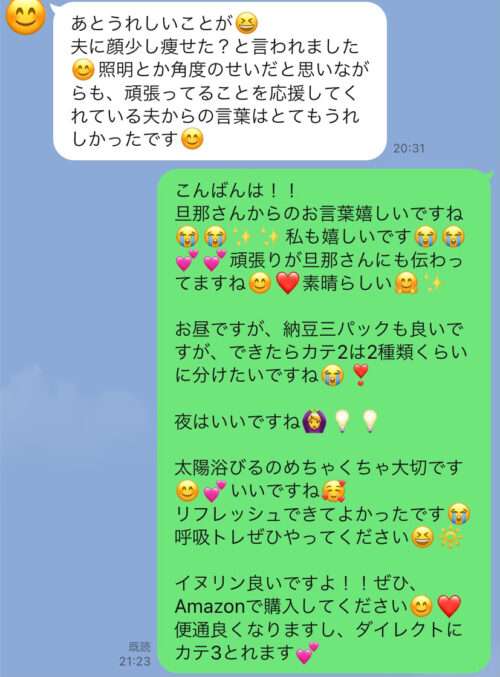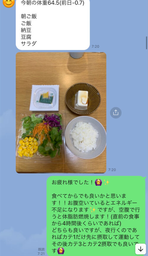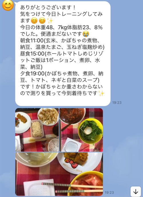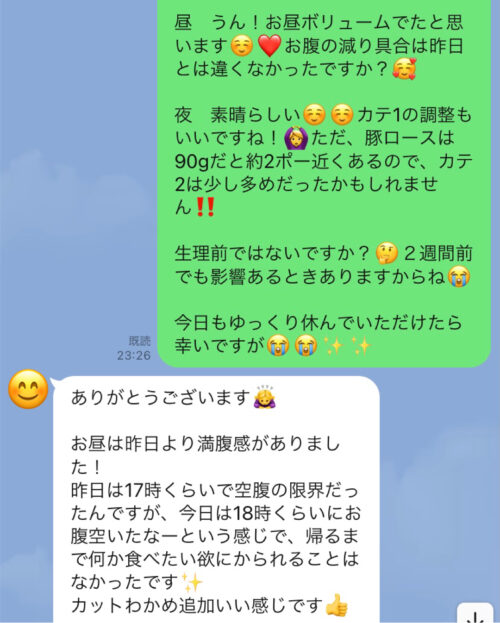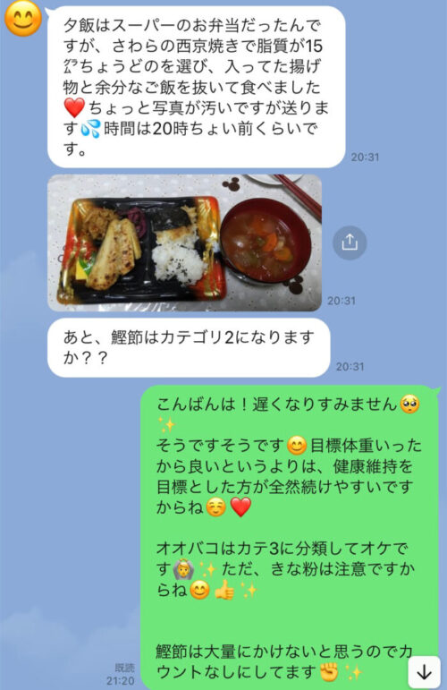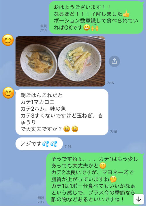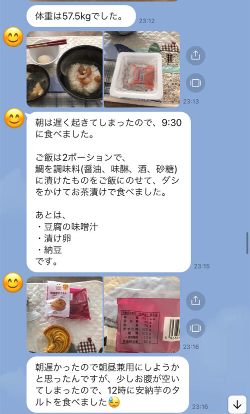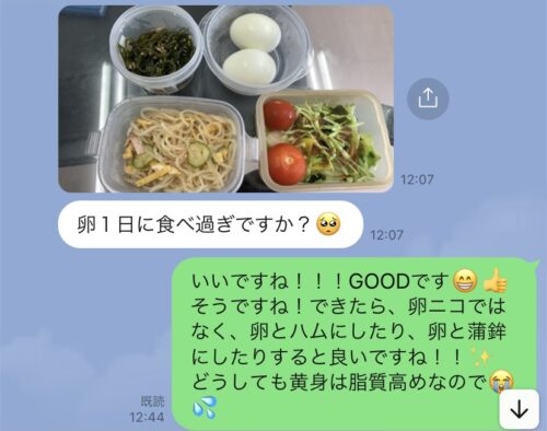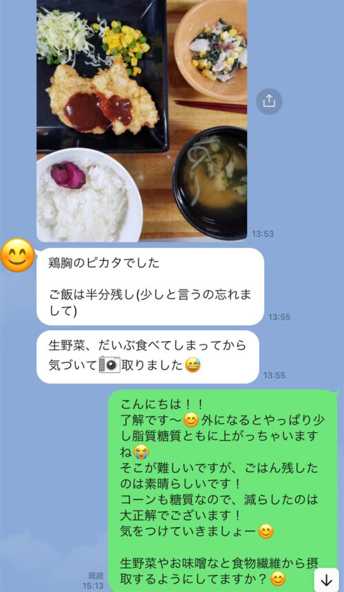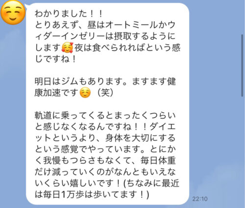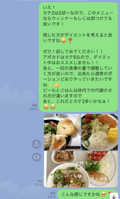 以下は今まで受講した生徒さんとの実際のやりとりです!オンラインダイエットでは、その方のライフスタイルに合わせて食事管理をしていきます^^