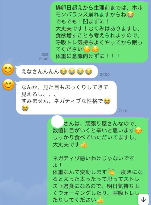 小さな事ですが、このような事がダイエットの成功に導く重要な要素でもあるんですね。嫌なことや、イライラしたときはぜひ気軽に連絡していただけると、こちらも嬉しいです^^
