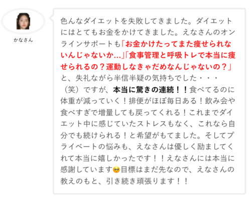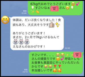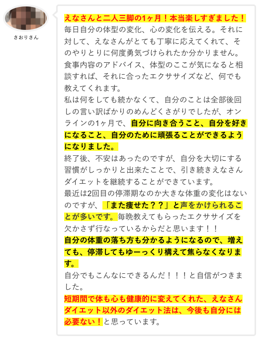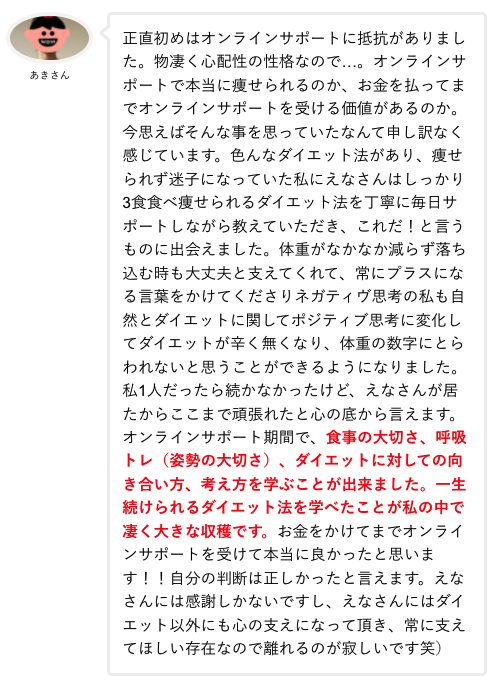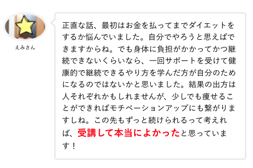 「正直この値段でいいの!?ってくらい良いサポートでした。4kgも痩せたのが不思議です笑!」