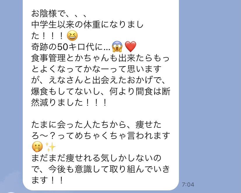 外食してたし、嫌々飲み会にも参加してたんですけどね‥でも、周りの人から「痩せた?」って聞かれると結構身体変わっているんだな!って思って結構嬉しくなりました!