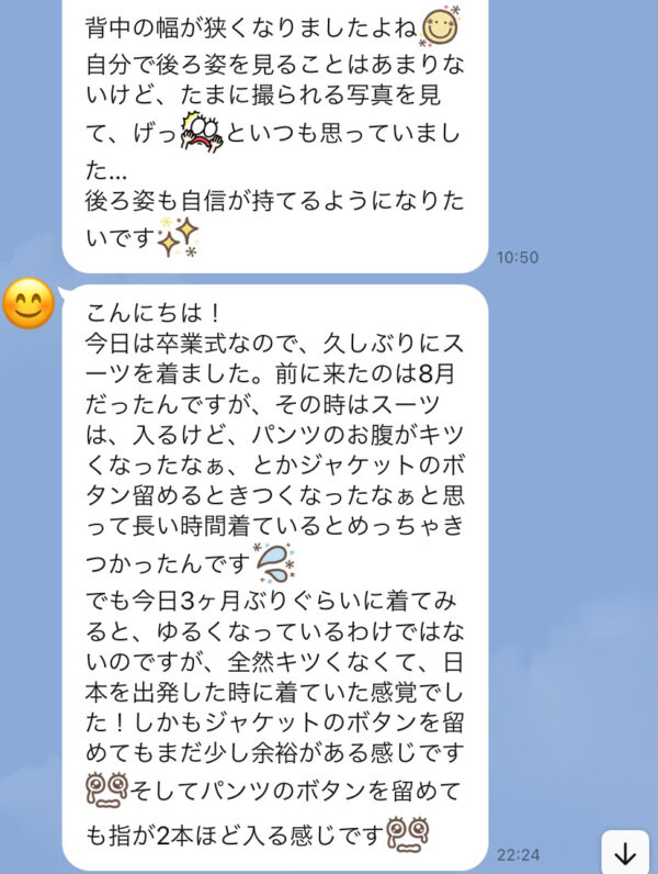 ビフォーアフターの後ろ姿が全然違っていたり、本当に嬉しいことばかりでさらに頑張ろうと思えました。