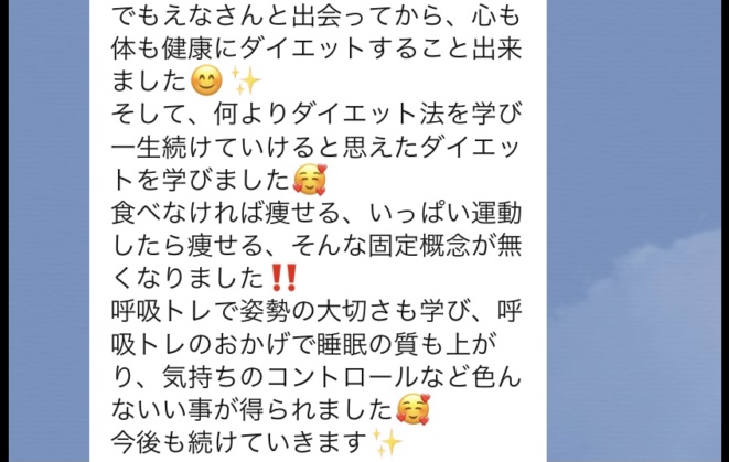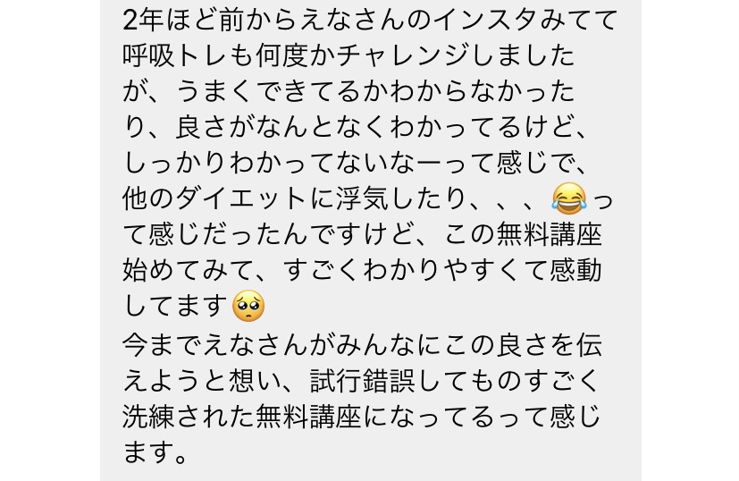 色んなダイエット法があり、痩せられず迷子になっていた私にしっかり3食食べて、呼吸改善だけで、痩せられるこれだ!と言うダイエット法に出会えました。
