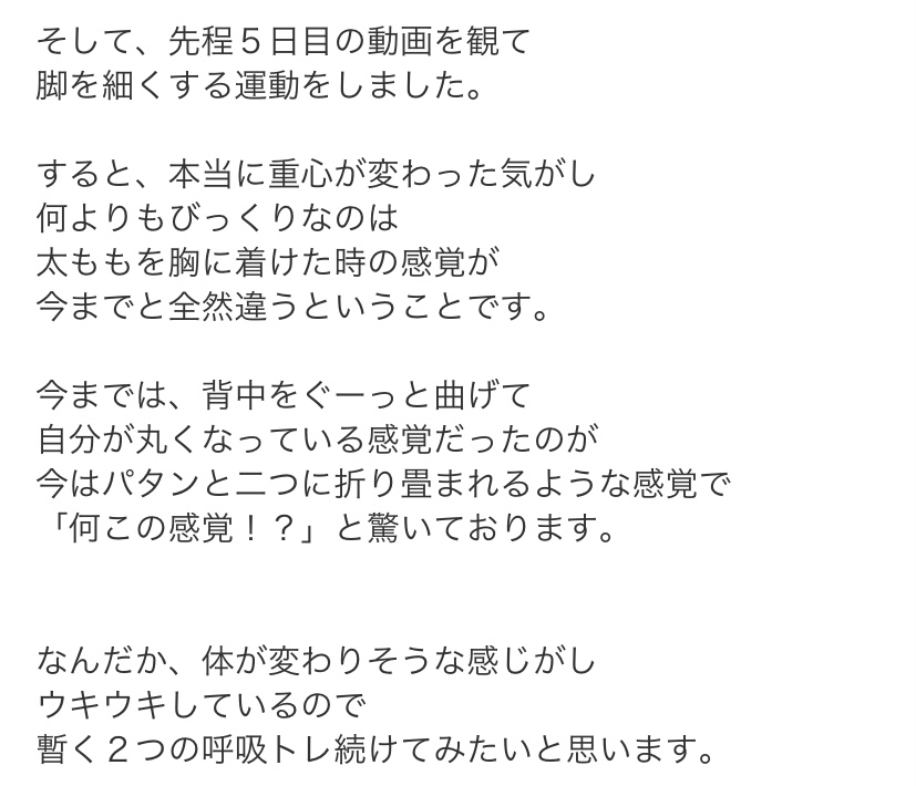 いっぱい運動しなきゃ痩せない!って思い込んでいたので、呼吸トレだけで変わっていく身体をみて単純にすごいな〜って感じです✨